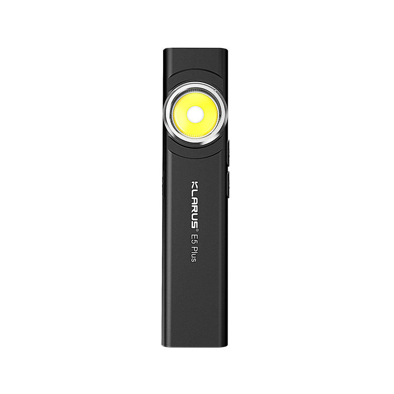 Le clip de la lampe de travail Klarus E5 Plus en fait une excellente lampe d'angle droit pour les petits travaux à la maison ou pour un éclairage stable au travail. Cela fait également de cette lampe une lampe frontale d'urgence en la fixant au rebord de votre chapeau ou casquette. L'ergonomie améliorée présente des interrupteurs positionnés 8mm plus haut que l'E5 original pour une facilité d'utilisation accrue.